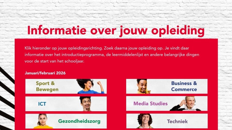 Klik onderstaand jouw opleidingsrichting aan en navigeer vervolgens naar de juiste opleiding. Daar vind je informatie over het introductieprogramma, je leermiddelenlijst en overige belangrijke informatie voor de start van het schooljaar.